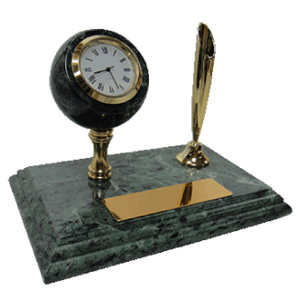 The green marble is unique color in the world. There’s a stylish clock like globe can be rotate. The clock we cladding is also by green marble. We can see the standard time on the clock and also can be set up you need. It’s also have golden classic pen holder and black ball pen on the marble. It’s have golden plate on the it. The size for the plate is 2cm x 7cm can be print the logo you need.