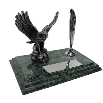 There’s eagle spread the winds and stand on the marble like the eagle ready to fly and catch the prey. The eagle emerge brave and fearless. It’s also have chrome classic pen holder and black ball pen on the marble. It’s have chrome plate on the it. The size for the plate is 2cm x 7cm can be print the logo you need.