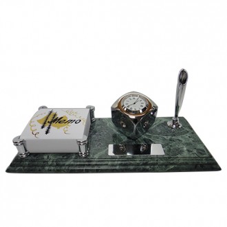 There are clock cladding by metal and metal memo holder electroplate chrome on the stylish marble.It's have classic pen holder chrome and black ball pen.It's also have chrome plate on the stylish marble. The plate size is 2cm x7cm, it's also can print the logo you need.