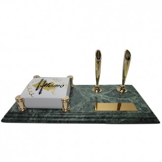 There is metal memo holder electroplate gold on the stylish marble.It's have classic pen holders gold and black ball pens. It's also have gold plate on the stylish marble. The plate size is 2cm x7cm can print the logo you need.