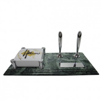 There is metal memo holder electroplate gold on the stylish marble.It's have classic pen holders gold and black ball pens. It's also have gold plate on the stylish marble. The plate size is 2cm x7cm can print the logo you need.