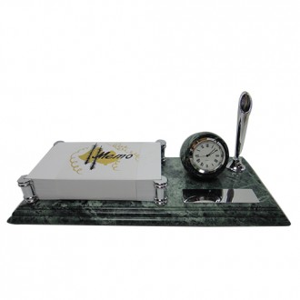 There are clock cladding with marble and metal memo holder electroplate chrome on the stylish marble.It's have classic pen holder chrome and black ball pen.It's also have chrome plate on the stylish marble. The plate size is 2cm x7cm can print the logo you need.