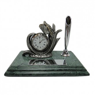 The green marble is unique color in the world. There is beauty flower twisting with sliver clock. It’s also have chrome classic pen holder and black ball pen on the marble. It’s also have chrome plate on it. The size for the plate is 2cm x 7cm can be print the logo you need.