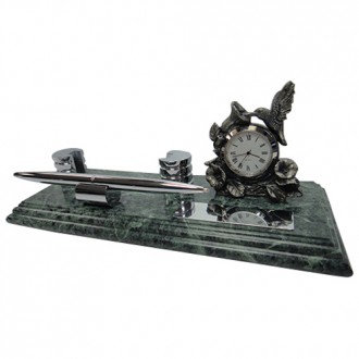 The green marble is unique color in the world. There are artistic clock and chrome metal name card holder on the marble. It’s have metal pen and metal holder. It’s have chrome plate on it. The size for the plate is 2cm x 7cm