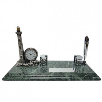The green marble is unique color in the world. There are artistic clock and chrome metal name card holder on the marble. It’s also have chrome classic pen holder and black ball pen on the marble. It’s have chrome plate on it. The size for the plate is 2cm x 7cm.