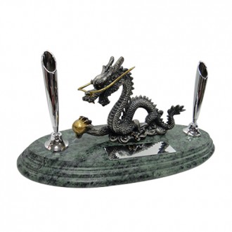 The green marble is unique color in the world. There is grandeur dragon on the marble. It’s also have chrome classic pen holders and black ball pens on the marble. It’s have chrome plate on it. The size for the plate is 2cm x 7cm.