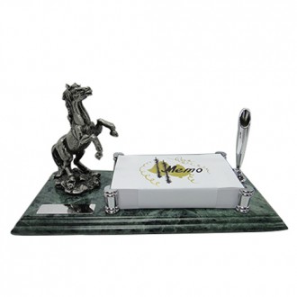 The green marble is unique color in the world. There are warhorse and memo holder on the marble. It’s also have chrome classic pen holders and black ball pens on the marble. It’s have chrome plate on it. The size for the plate is 2cm x 7cm.