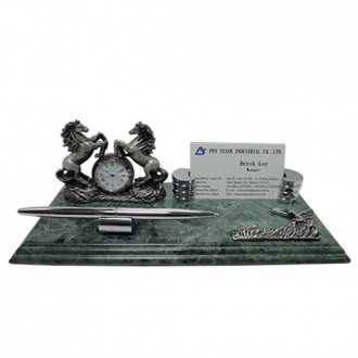 The green marble is unique color in the world. There are artistic clock 、 name card holder and eagle ornament. It’s also have chrome metal pen and metal holder. It’s have chrome plate on it. The size for the plate is 2cm x 7cm.