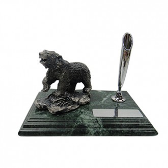 The green marble is unique color in the world. There are polar bear stand on the snow field. It’s also have chrome classic pen holder and black ball pen on the marble. The size for the plate is 1.5cm x 5.5cm.It’s can be print the logo you need.