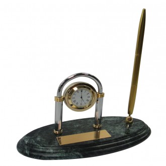 The green marble is unique color in the world. Stylish metal clock and electroplate gold and chrome. Simple but grace. It’s have golden hairline glare pen and holder on the marble. The size for the gold plate is 2cm x 7cm. It’s can be print the logo you need.