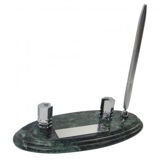 The green marble is unique color in the world. There is metal business holder and electroplate chrome. It’s have chrome hairline glare pen and holder on the stylish marble. Its’ have chrome plate on it. The size for the chrome plate is 2cm x 7cm. It’s can be print the logo you need.