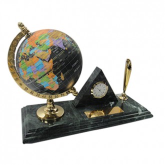 The green marble is unique color in the world. There is modern black globe and easy to see the world map on it and also have triangle nature marble with golden clock. It’s have classic golden pen holder and black ball pen. The size for the golden plate is 2cm x 7cm. It’s can be print the logo you need.
