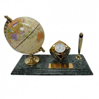 The green marble is unique color in the world. There are modern white globe and easy to see the world map on it and cubic clock made by electroplate gold. It’s looks very quality. It’s also have classic golden pen holder and black ball pen. The size for the golden plate is 2cm x 7cm. It’s can be print the logo you need.