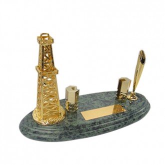 The green marble is unique color in the world. There is metal quality oil derrick and metal business card holder and electroplate gold. It’s also have classic golden pen holder and black ball pen. The size for the golden plate is 2cm x 7cm. It’s can be print the logo you need.