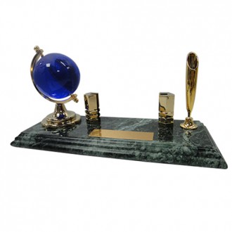 The green marble is unique color in the world. There are crystal globe blue and metal business card holder electroplate gold. It’s also have classic golden pen holder and black ball pen. The size for the golden plate is 2cm x 7cm. It’s can be print the logo you need.
