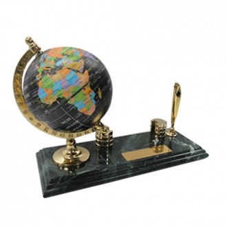 The green marble is unique color in the world. There are black modern globe and metal business card holder electroplate gold. It’s also have classic golden pen holder and black ball pen. The size for the golden plate is 2cm x 7cm. It’s can be print the logo you need.