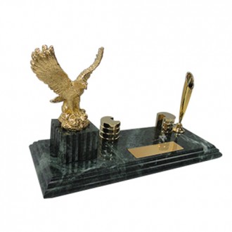 The green marble is unique color in the world. There are golden eagle stand on the marble pillar and metal business card holder electroplate gold. It’s also have classic golden pen holder and black ball pen. The size for the golden plate is 2cm x 7cm. It’s can be print the logo you need.