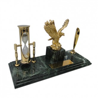 The green marble is unique color in the world. There are golden sandglass and golden eagle stand on the marble pillar. It’s also have classic golden pen holder and black ball pen. The size for the golden plate is 2cm x 7cm. It’s can be print the logo you need.