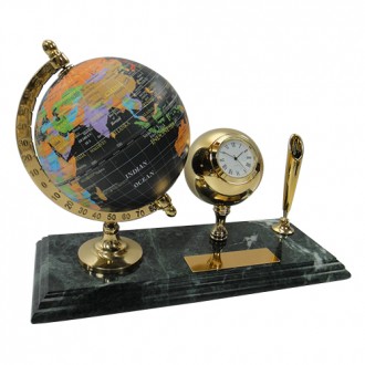 The green marble is unique color in the world. There are world modern globe and metal clock gold. It’s also have classic golden pen holder and black ball pen. The size for the golden plate is 2cm x 7cm. It’s can be print the logo you need.