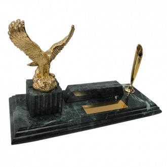 The green marble is unique color in the world. There are golden eagle stand on the marble pillar and marble business card holder. It’s also have classic golden pen holder and black ball pen. The size for the golden plate is 2cm x 7cm. It’s can be print the logo you need.
