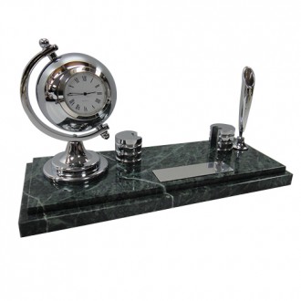 The green marble is unique color in the world. There are luxury metal globe chrome and business card holder chrome. It’s also have classic chrome pen holder and black ball pen. The size for the chrome plate is 2cm x 7cm. It’s can be print the logo you need.