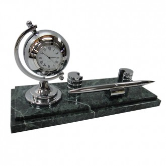 The green marble is unique color in the world. There are luxury metal globe chrome with clock and business card holder chrome. It’s have metal pen chrome.