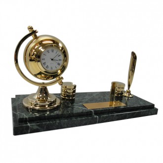 The green marble is unique color in the world. There are luxury metal globe chrome and business card holder chrome. It’s also have classic golden pen holder and black ball pen. The size for the golden plate is 2cm x 7cm. It’s can be print the logo you need.