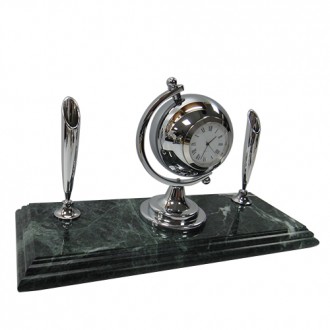 The green marble is unique color in the world. There are metal globe chrome with clock. It’s also have classic golden pen holders and black ball pens.