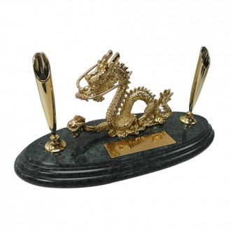 The green marble is unique color in the world. There are metal golden dragon. It’s also have classic golden pen holders and black ball pens.