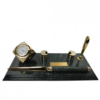 The green marble is unique color in the world. There are golden cubic clock and metal name card holder with marble letter opener. It’s also have classic golden pen holder and black ball pen. The size for the golden plate is 1.5cm x 5.5cm. It’s can be print the logo you need.