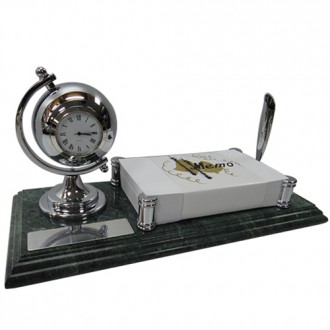 The green marble is unique color in the world. There are metal globe chrome with clock and 3in x 5in memo. It’s also have chrome classic pen holders and black ball pens on the marble. It’s have chrome plate on it. The size for the plate is 2cm x 7cm.