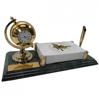 The green marble is unique color in the world. There are metal globe golden with clock and 3in x 5in memo. It’s also have golden classic pen holder and black ball pen on the marble. It’s have chrome plate on it. The size for the plate is 2cm x 7cm.