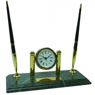 Marble desk set with golden clock and two black bal pens. It's also include name plate.The size for the plate is 2cm X 7cm.