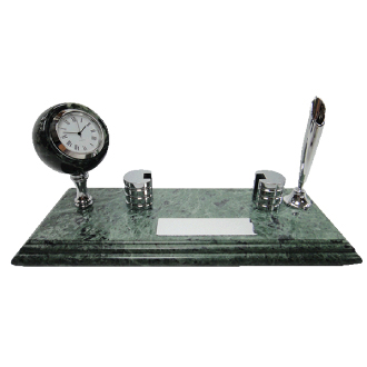 There is business card holder and clock cladding the marble can be rotate 360 degree. It’s also have plastic pen holder and ball pen on the marble. It’s also have chrome plate can print the logo you need and the size is 2cm x 7cm
