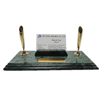 There are cuboid marble business card holder 、 golden plastic pen holders and black ball pens. It’s also have golden plate can print the logo you need and the size is 2cm x 7cm.