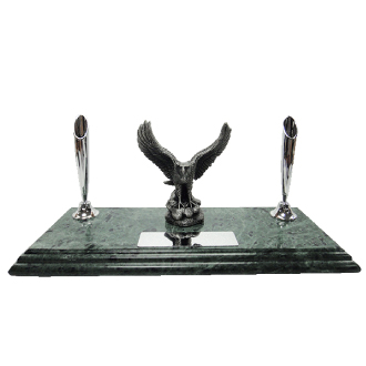 There’s eagle spread the winds and stand on the marble like the eagle ready to fly and catch the prey. The eagle emerge brave and fearless. It’s also have classic pen holders chrome and black ball pens on the marble. It’s have chrome plate on marble. The size for the plate is 2cm x 7cm can be print the logo you need.