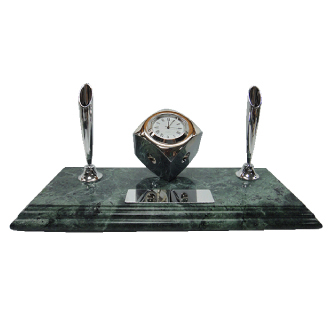 There’s cubic clock made by metal and electroplate chrome. It’s also have classic pen holders chrome and black ball pens. The chrome plate size is 2cm x 7cm can print the logo you need.