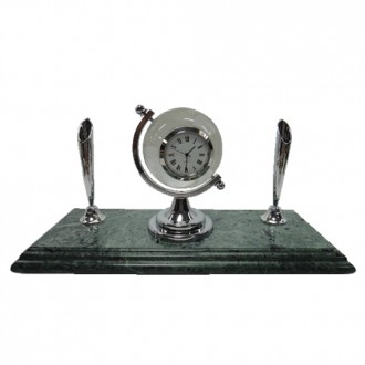 There is a transparent crystal globe with clock and chrome base on the stylish marble which can see the five continents on it. The double-decked base electroplate chrome make it more shinning and quality. It’s also have classic ball pens chrome and black ball pens.