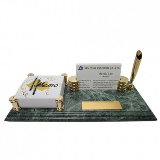 It's have classic pen holder gold and black ball pen.It's also have gold plate on the stylish marble. The plate size is 2cm x7cm, it's also can print the logo you need.
