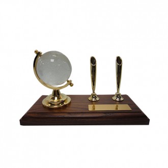 There is crystal blobe on it.It's have classic pen holder gold and black ball pen.It's also have gold plate on the wooden. The plate size is 2cm x7cm can print the logo you need.