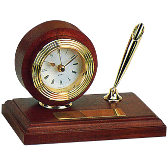 There are oak cladding golden clock with classic golden pen holder and black ball pen. The golden plate size is 2cm x 7cm.