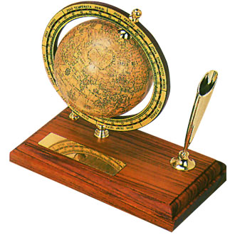 There are sailing globe with classic golden pen holder and black ball pen. The golden plate size is 2cm x 7cm.