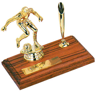 There are soccer figure with classic golden pen holder and black ball pen. The golden plate size is 2cm x 7cm.