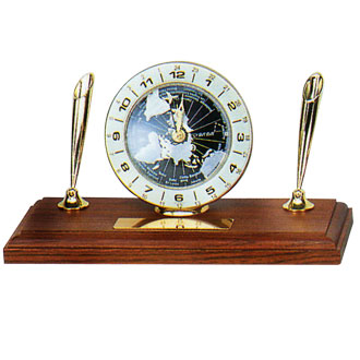 There are world clock with classic golden pen holder and black ball pens. The golden plate size is 2cm x 7cm.