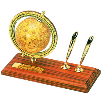 There are sailing globe with classic golden pens holder and black ball pens. The golden plate size is 2cm x 7cm.