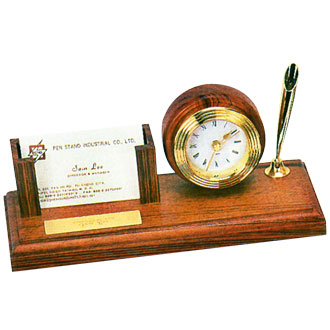 There are oak business card holder and oak cladding with golden clock with classic golden pen holder and black ball pen. The golden plate size is 2cm x 7cm.