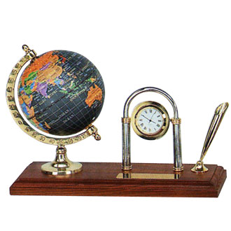 There are modern black globe and clock with classic pen holder and black ball pen.