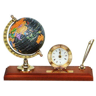 There are modern black globe and clock with classic pen holder and black ball pen.