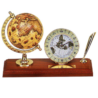 There are sailing globe and world clock with classic pen holder and black ball pen.