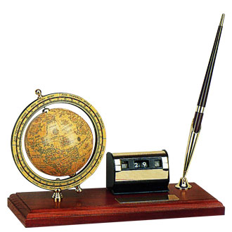 There are sailing globe and triangle oak cladding clock with classic pen holder and black ball pen.
